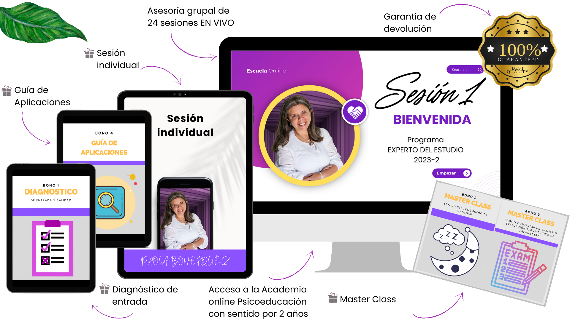 Experto del Estudio es un programa grupal online sincrónico que tiene una duración de 3 meses con 12 sesiones teórico-prácticas de asesoría grupal cada una de 2 horas, junto con 12 Clubes prácticos online de igual duración. Este programa totaliza 48 horas de participación en VIVO.